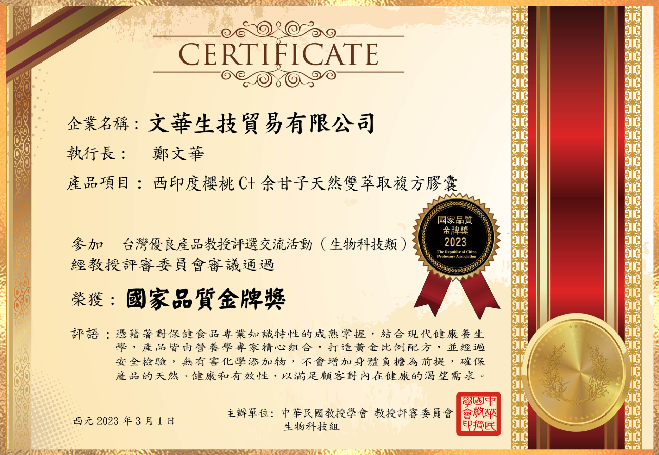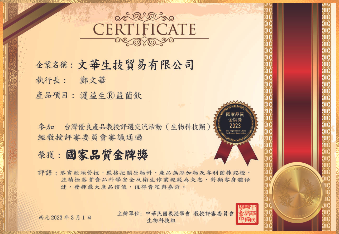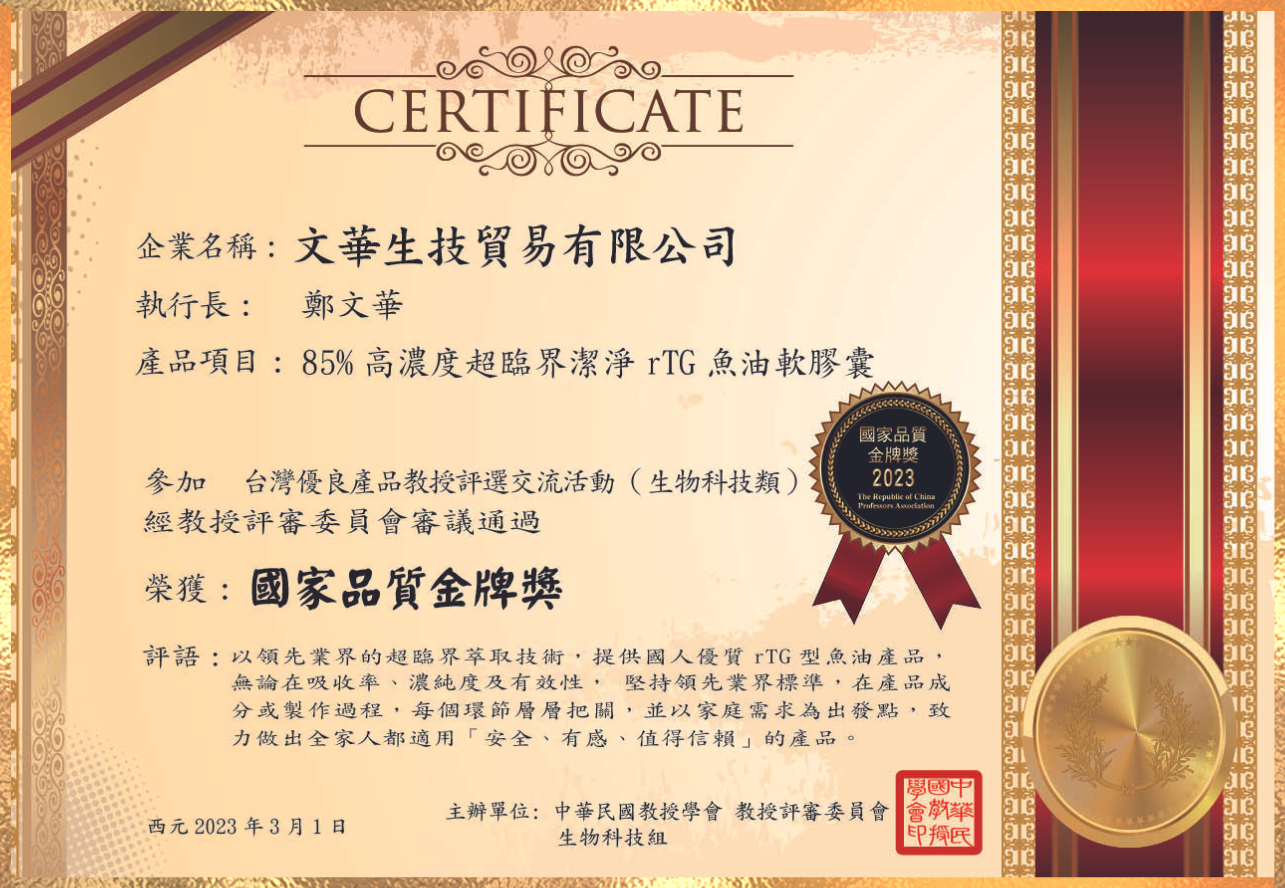 透過公正第三方專業認證,由台灣百大教授評選團一致給予最高評價,榮獲2020台灣生技大獎、2020卓越企業品牌獎。
