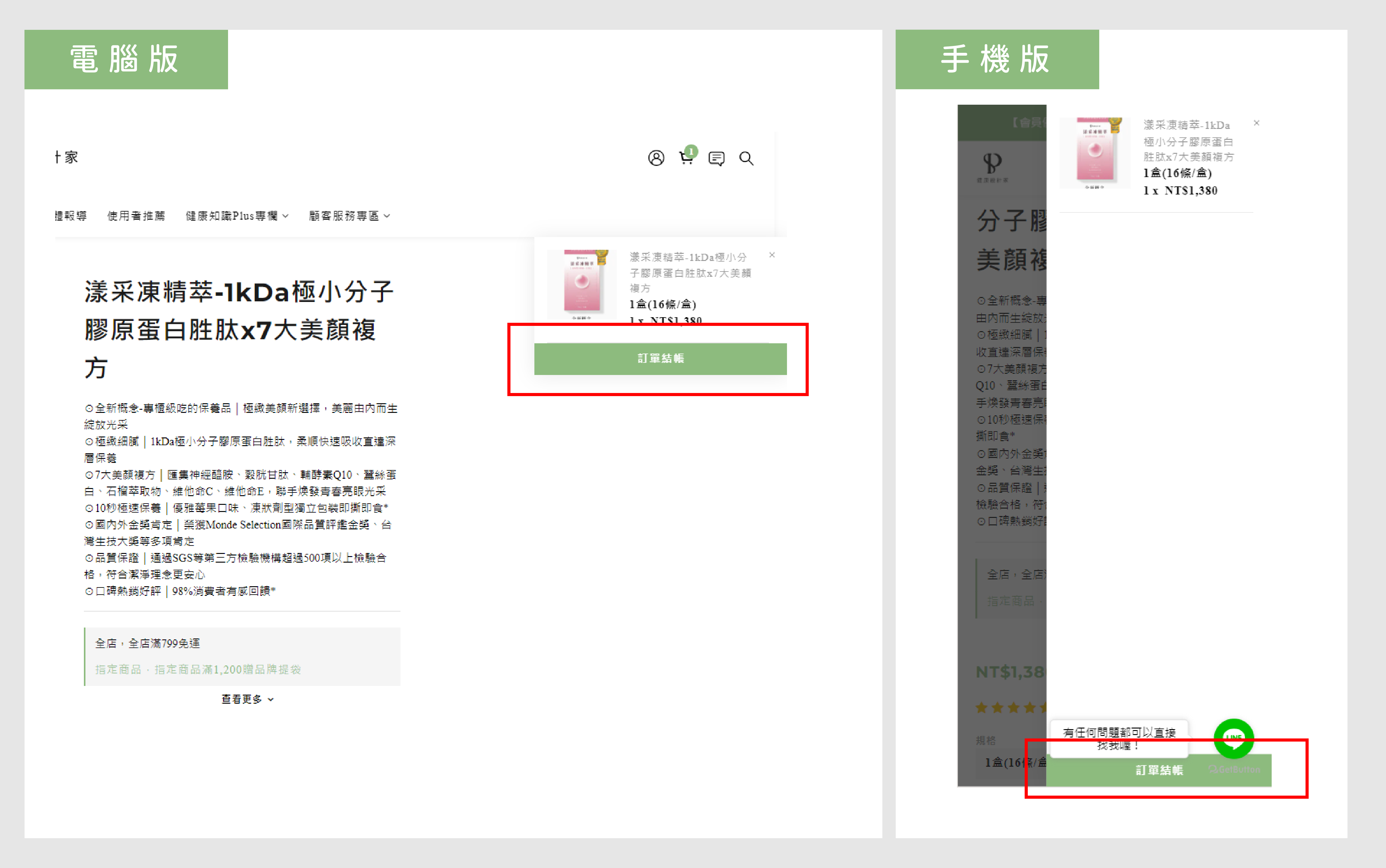 將所有想要的商品都加入購物車後,點擊右上方「購物車」,接著點選框框內的「訂單結帳」按鈕 (手機版示意圖如下),以前往訂單結帳頁面繼續購買流程。