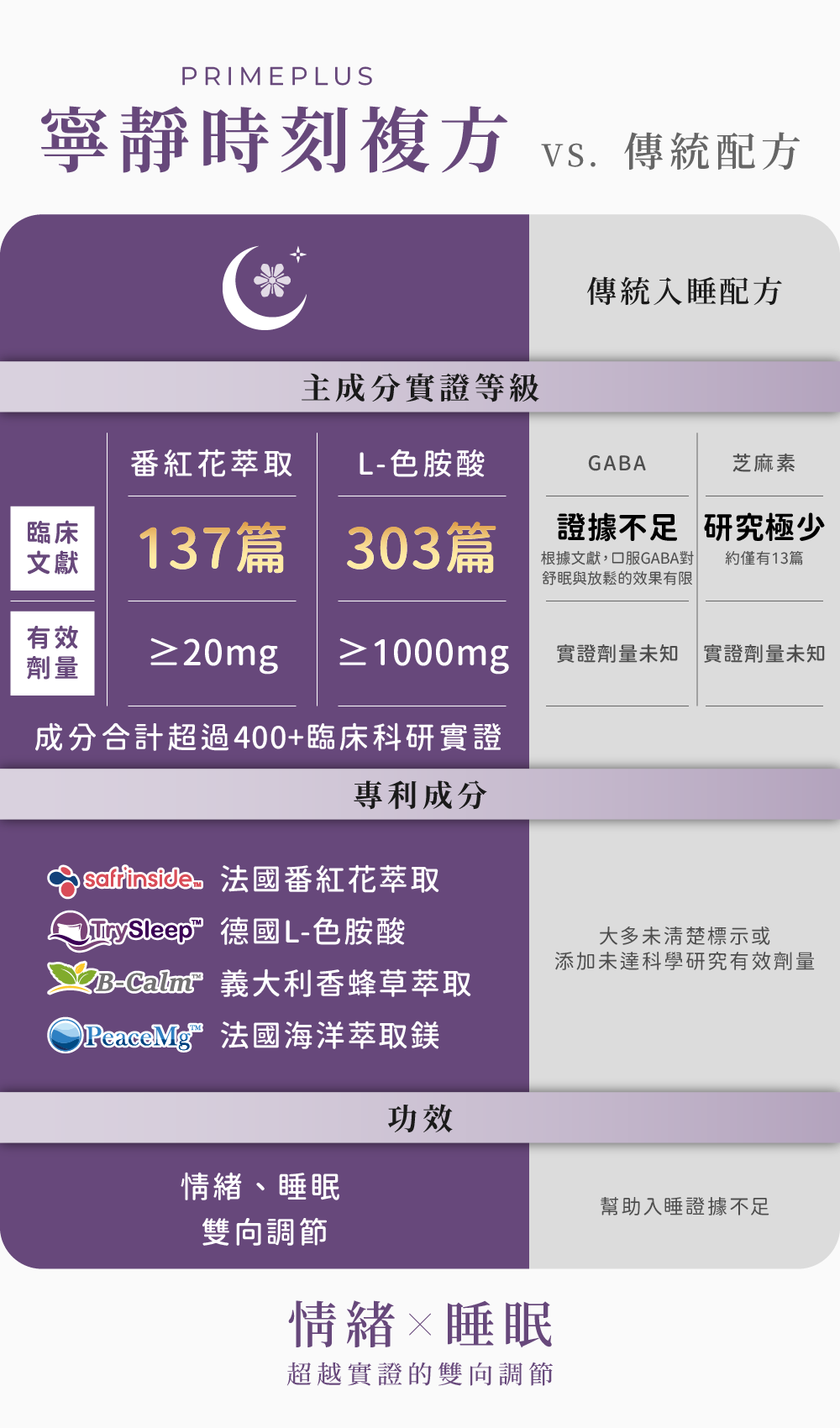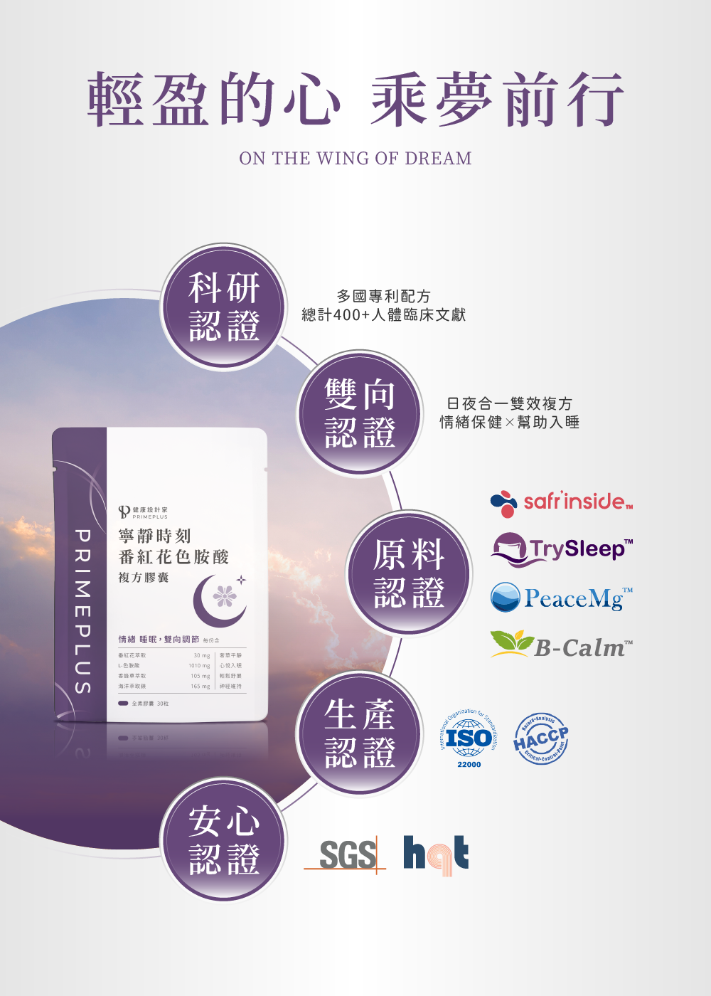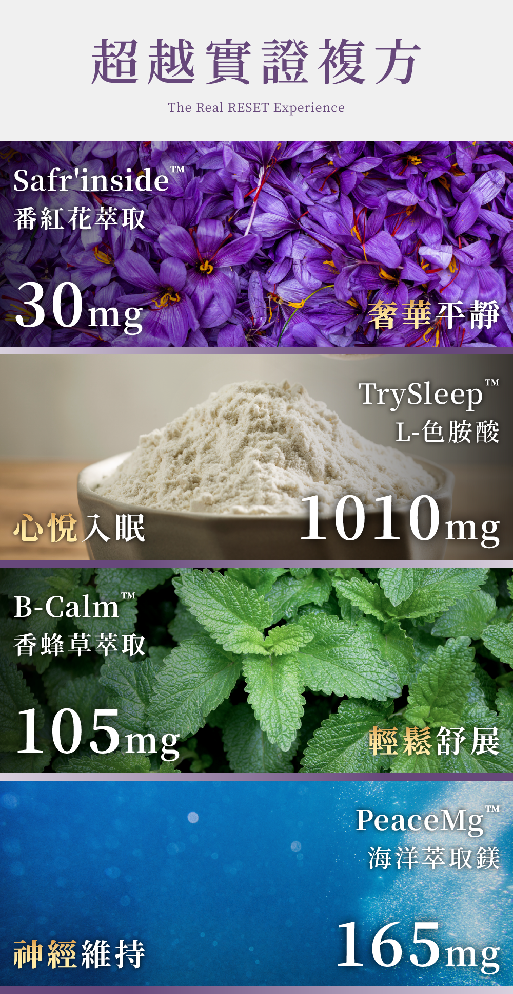 「寧靜時刻複方膠囊」嚴選四大新趨勢實證成分,其中番紅花萃取與L-色胺酸使用超越文獻的劑量,真實幫助入睡。再加上香蜂草萃取與海洋萃取鎂輔助,同步調整作息、維持神經功能。相比一般配方使用文獻資料與實證劑量不足的助眠成分,能帶來更全面的休息調節效果,達成日夜合一的寧靜時刻。