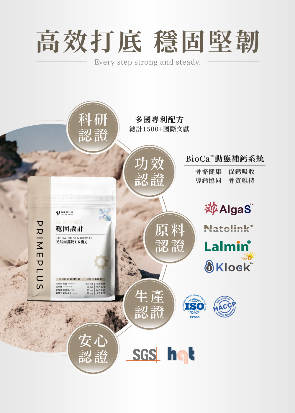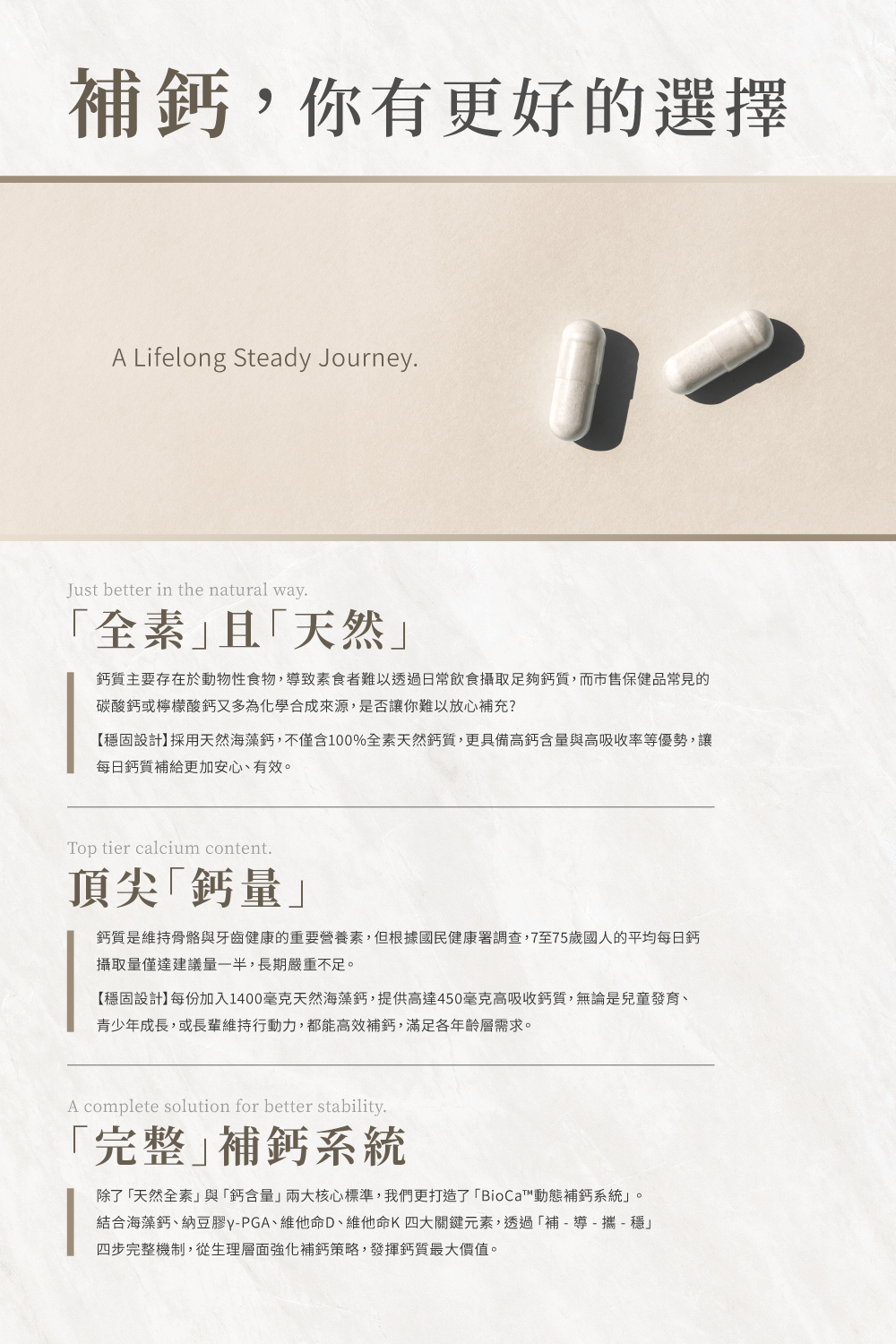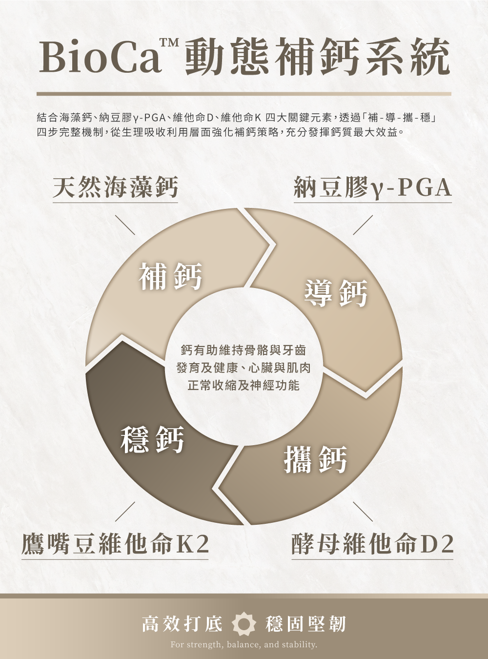 【穩固設計】每份含1,400毫克天然海藻鈣,可提供450毫克鈣質,並以39%高吸收率脫穎而出,補充效率優於市售常見碳酸鈣、檸檬酸鈣等化學合成鈣。同時結合海藻鈣、納豆膠γ-PGA、酵母維他命D與鷹嘴豆發酵萃取維他命K2,打造「BioCa™動態補鈣系統」,透過「補 - 導 - 攜 - 穩」四步機制,從生理吸收利用層面強化補鈣策略,充分發揮鈣質最大效益。