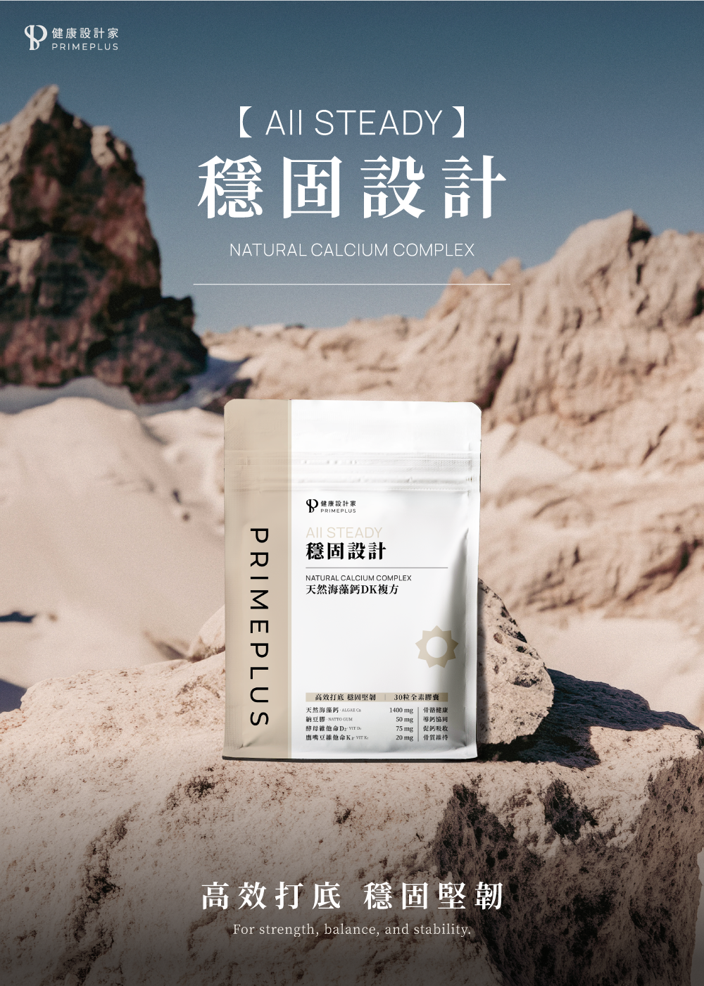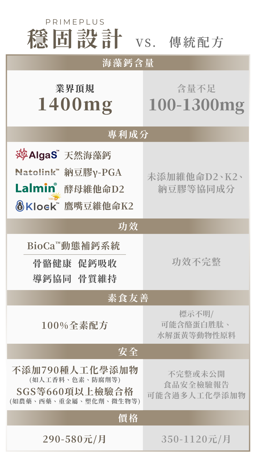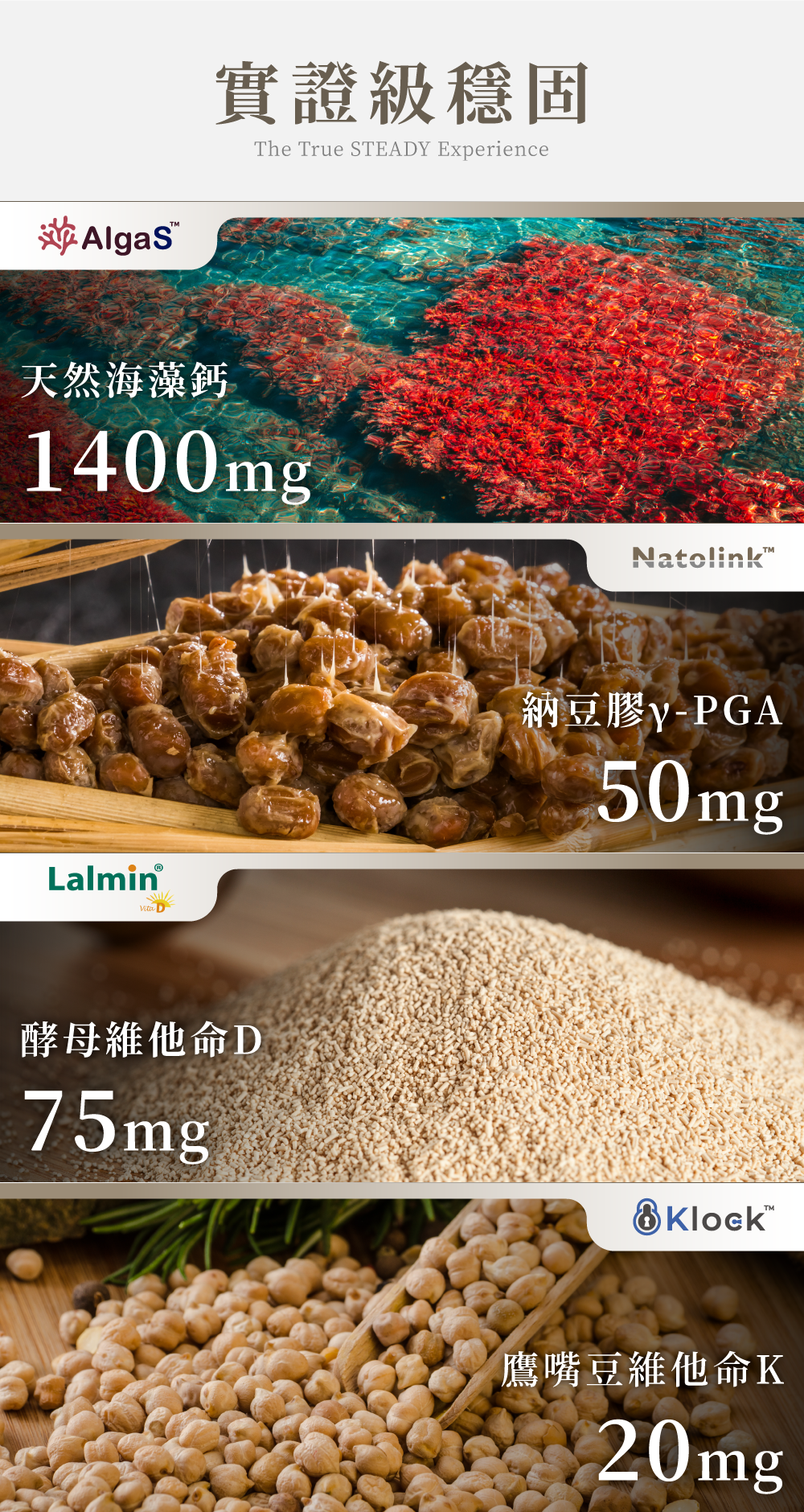 【穩固設計】每份含1,400毫克天然海藻鈣,可提供450毫克鈣質,並以39%高吸收率脫穎而出,補充效率優於市售常見碳酸鈣、檸檬酸鈣等化學合成鈣。同時結合海藻鈣、納豆膠γ-PGA、酵母維他命D與鷹嘴豆發酵萃取維他命K2,打造「BioCa™動態補鈣系統」,透過「補 - 導 - 攜 - 穩」四步機制,從生理吸收利用層面強化補鈣策略,充分發揮鈣質最大效益。