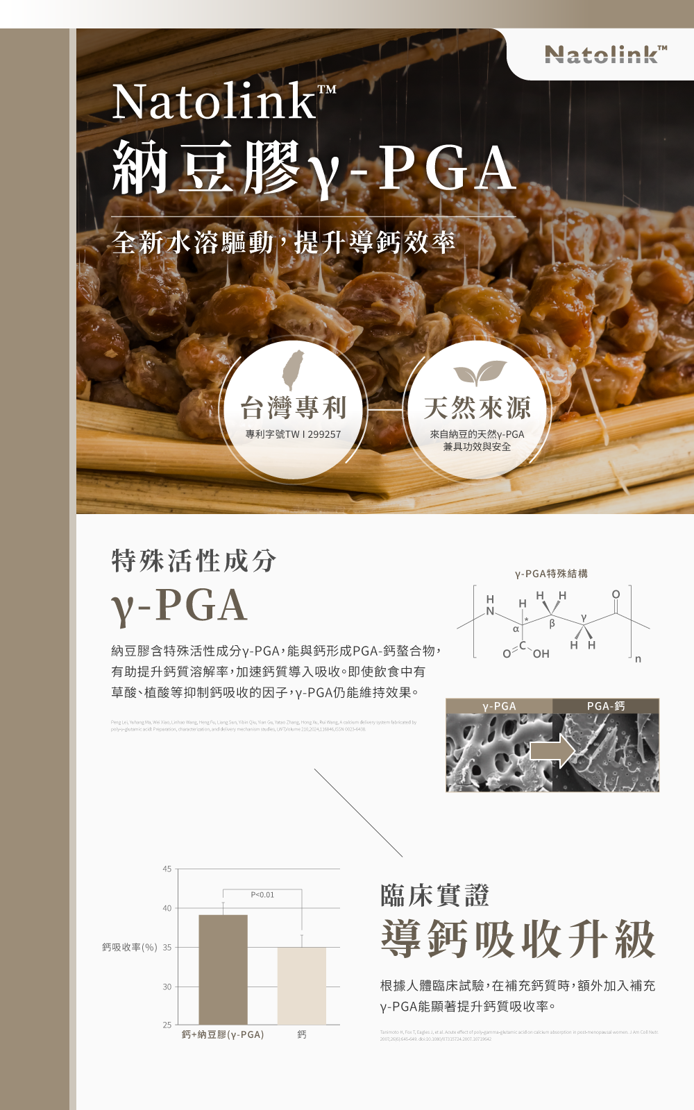 納豆膠由自然發酵產生,富含活性成分γ-PGA(聚麩胺酸),能有效增加鈣質溶解性,使鈣質在消化道中形成可溶狀態,進一步導入鈣質提升消化吸收效率。