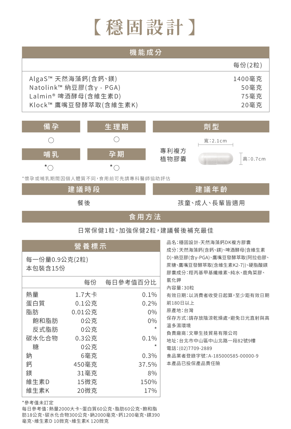 「【穩固設計】為100%全素配方,特別適合素食者、飲食缺鈣、成長期、更年期、長輩、孕婦等高鈣質需求族群,輕鬆補足各年齡層鈣質所需。