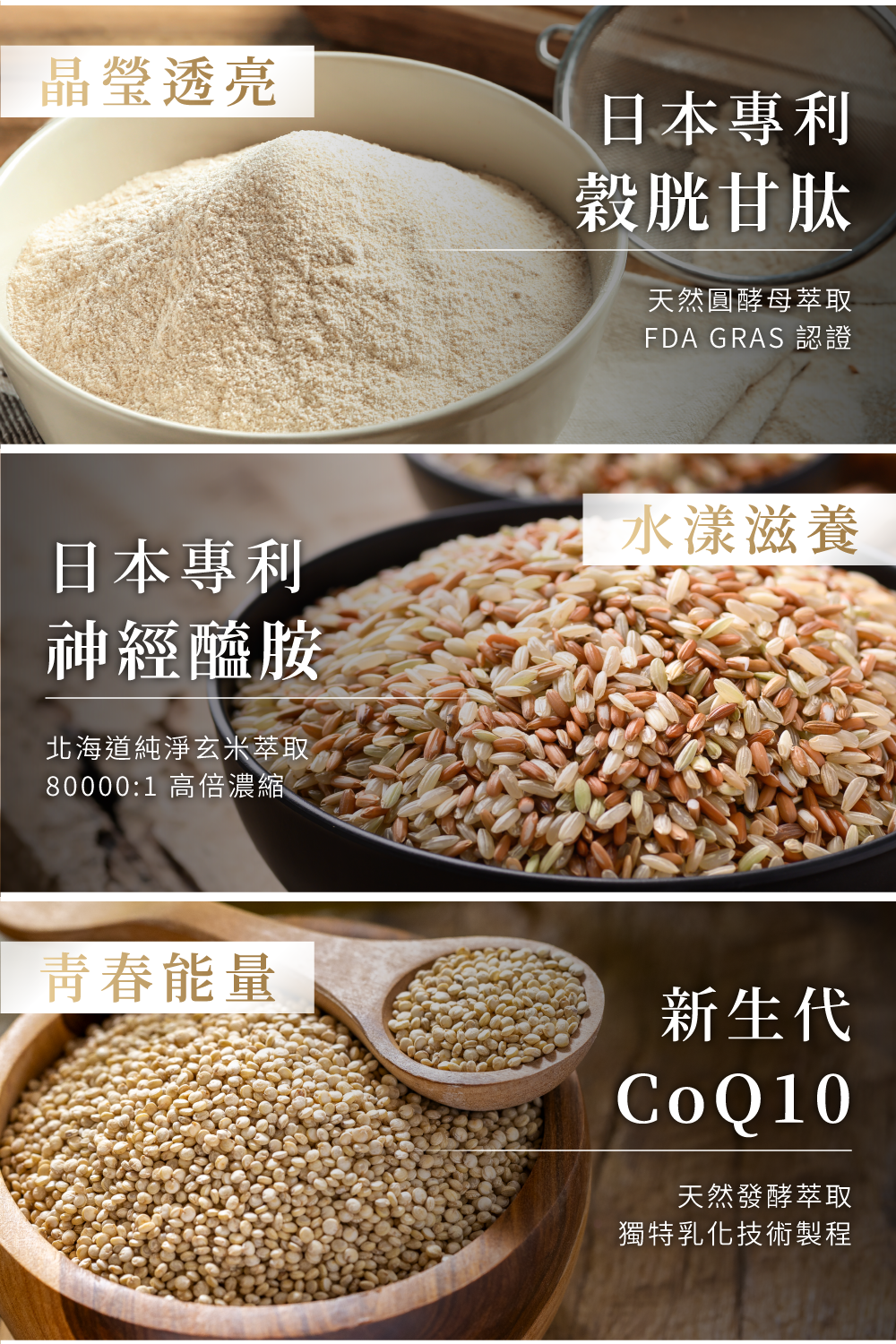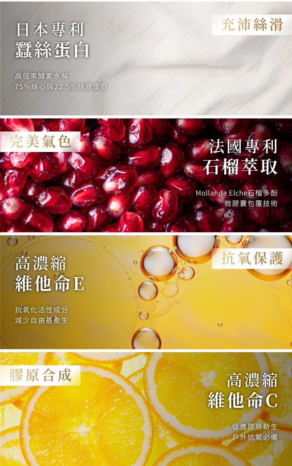 ⊙ 專櫃級8合1|膠原蛋白胜肽、穀胱甘肽、神經醯胺、CoQ10、蠶絲蛋白、石榴多酚、維他命C、維他命E