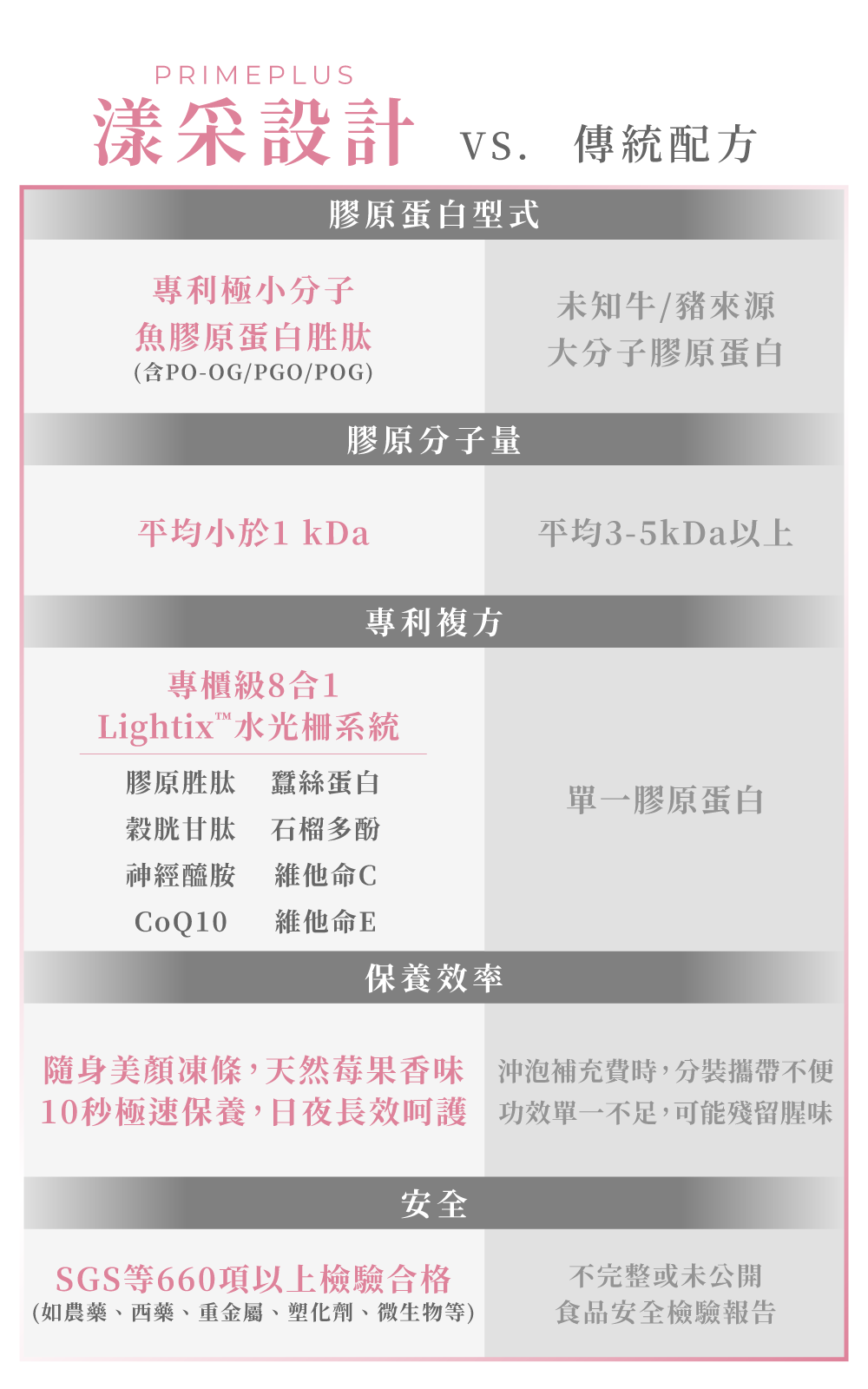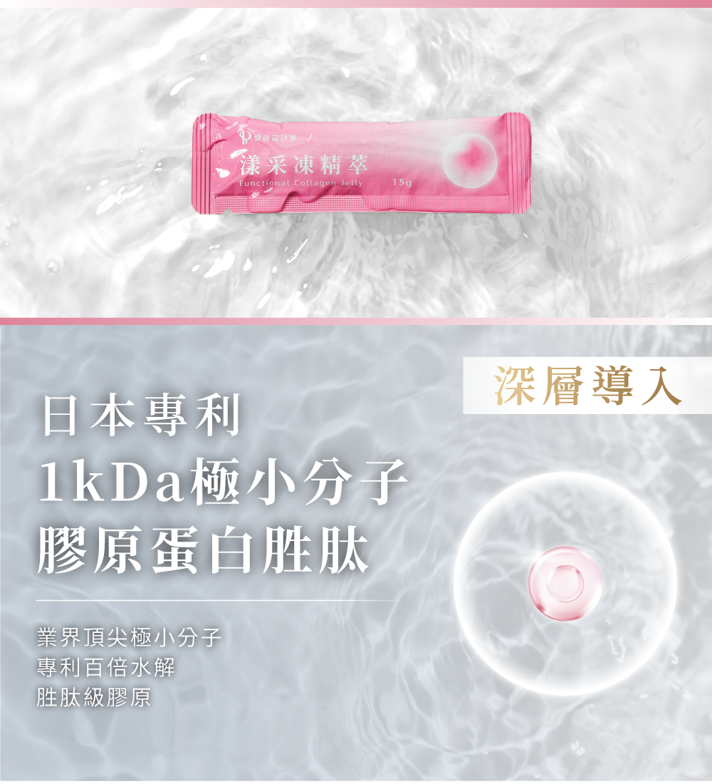 根據科學研究,相較常見3-5kDa分子量的膠原蛋白,小於1kDa的膠原蛋白胜肽,更能迅速滲透吸收,並且精準作用於深層。