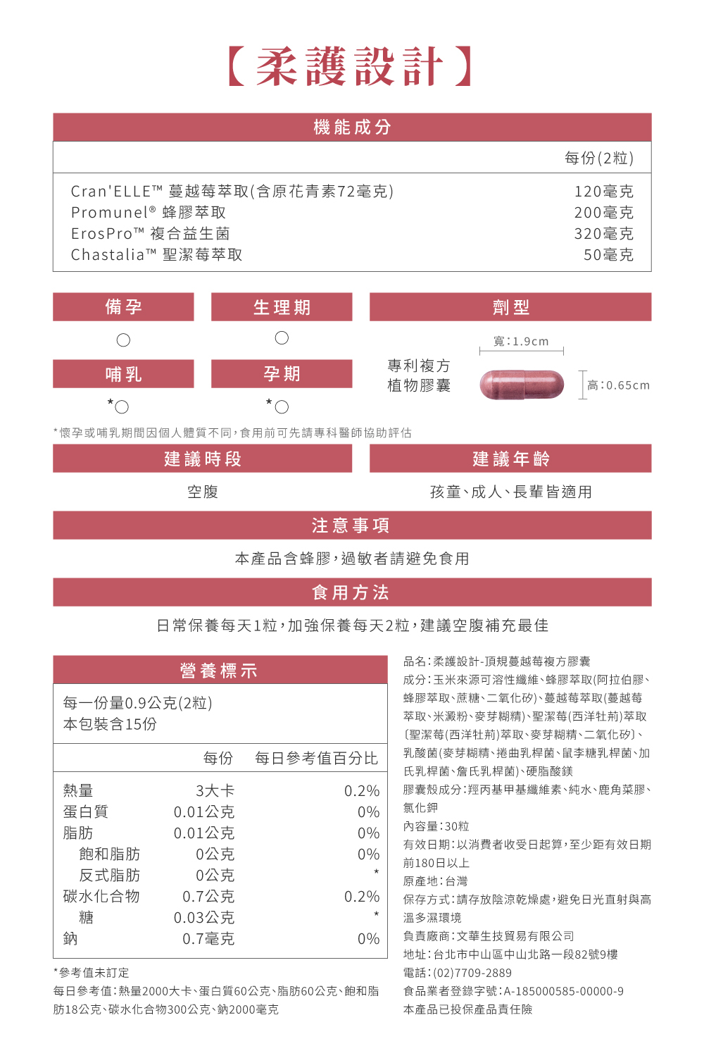 「柔護設計」以西班牙蔓越莓萃取為呵護核心,每份含有高達2倍實證的72毫克原花青素,並提供關鍵A型功效結構,給你最頂規的私密呵護。同時嚴選新趨勢呵護成分,其中金蜂膠萃取與蔓越莓萃取能產生協同作用,再搭配複合益生菌與聖潔莓萃取,強化柔護保養功效。相比單一蔓越莓成分,能帶來更全面的輕柔呵護,快速喚醒內在美好。