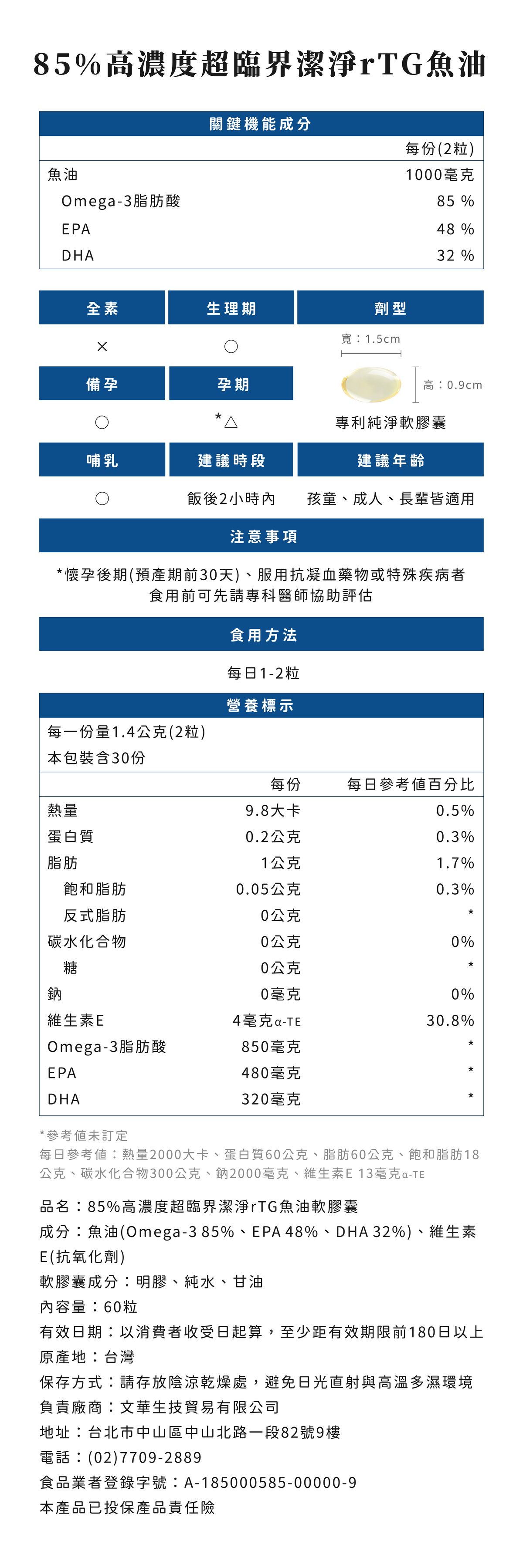 ⊙85%高濃度|Omega-3濃度超過85%,小顆好吞食