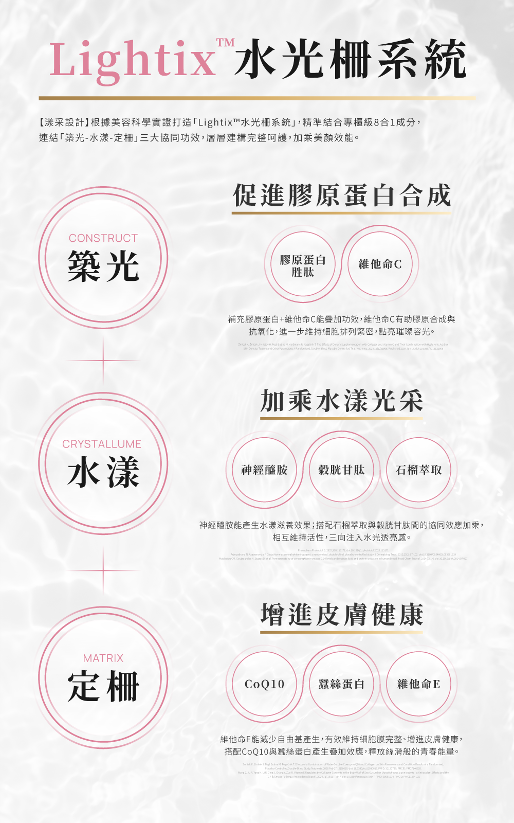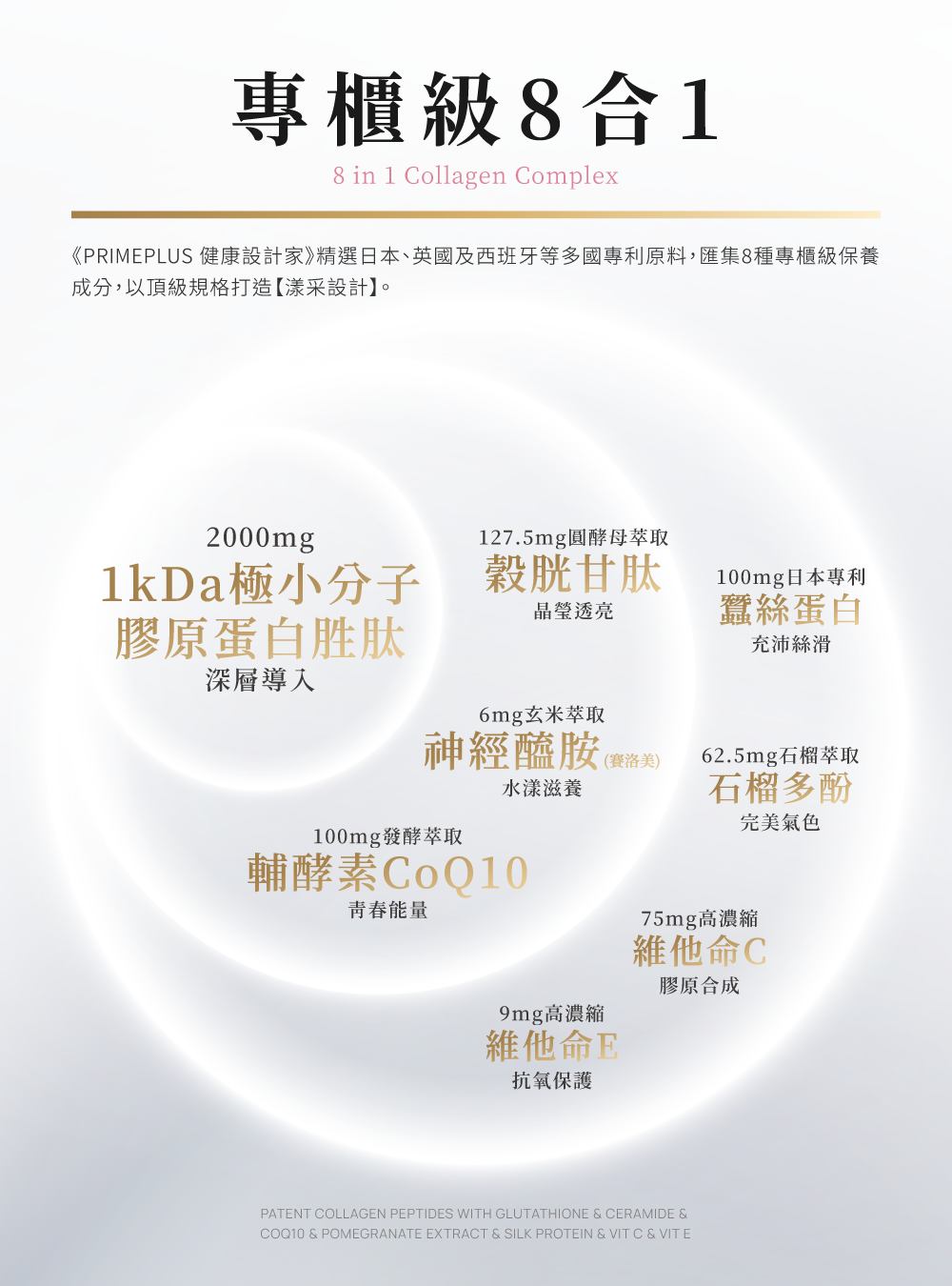⊙ 專櫃級8合1|膠原蛋白胜肽、穀胱甘肽、神經醯胺、CoQ10、蠶絲蛋白、石榴多酚、維他命C、維他命E