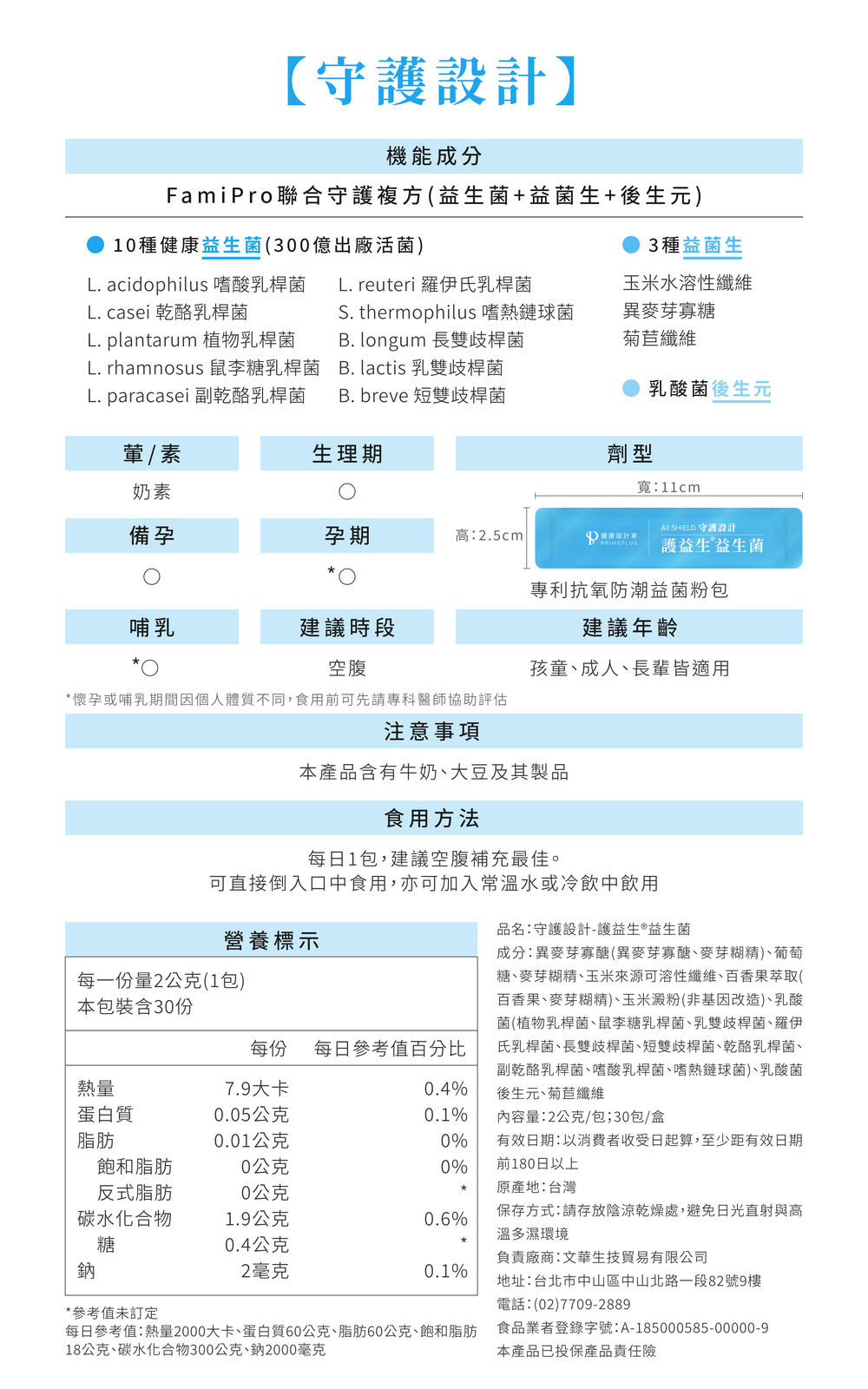 【守護設計】以「FamiPro聯合守護複方」為核心,結合「益生菌+益菌生+後生元」3要素。每包出廠含10種專利益菌與300億活菌,讓消化順暢、體質調整、病後補養都能一次到位。相比單一益生菌配方,更能互相聯合加乘給全家人最好的守護,因應生活中的各種挑戰。