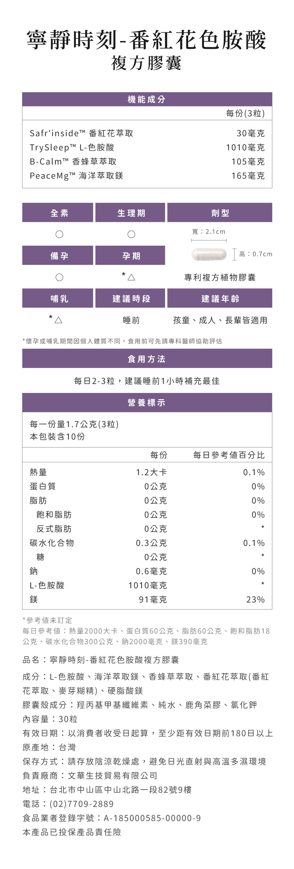 「寧靜時刻膠囊」不含有任何西藥、安眠藥等藥性成分,不會產生嗜睡與藥物依賴性,您可以安心補充。